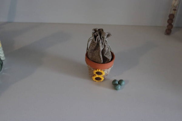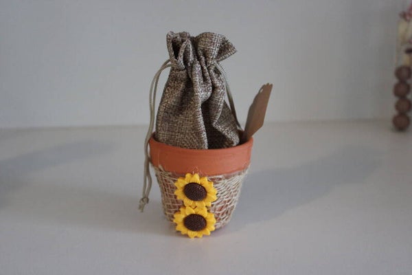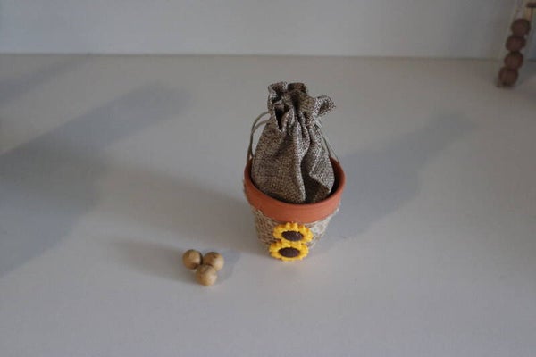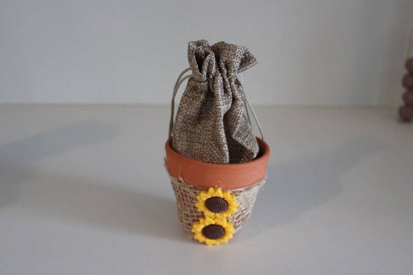 Materiaal: stenen potje met juten zakje versiert met jute en zonnebloemen uit hars
