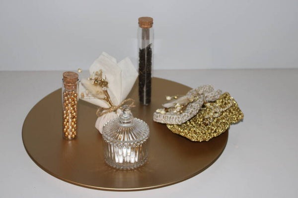 Presentatietip: Presenteer de items op een van onze gouden of witte schalen (te vinden bij presentatiestukken). Werk het geheel af met een flowerhoop of enkele vaasjes met droogbloemen in goud en wit voor een feestelijke uitstraling.