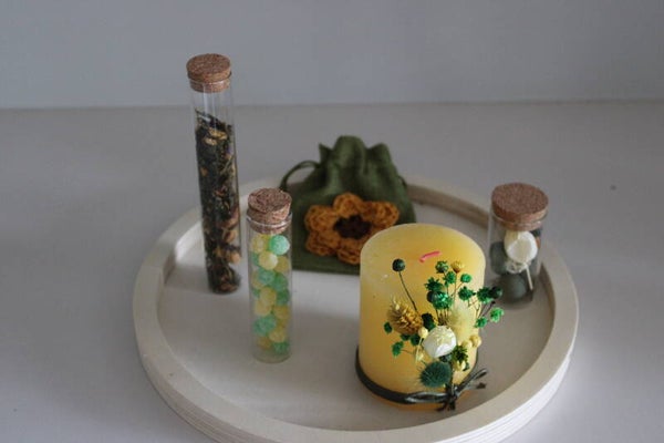 Presentatietip: Schik de items samen op een witte schaal of houten schijf uit onze collectie presentatiestukken. Enkele losse droogbloemen in geel en groen maken het geheel extra uitnodigend.