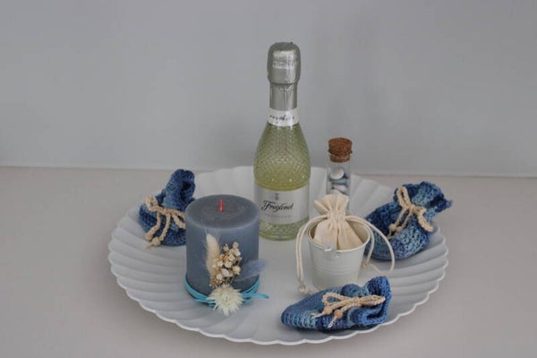 Vier de geboorte in stijl met dit frisse en elegante pakket uit onze blauwe collectie. Perfect samengesteld voor 50 personen, telkens 10 stuks per item: