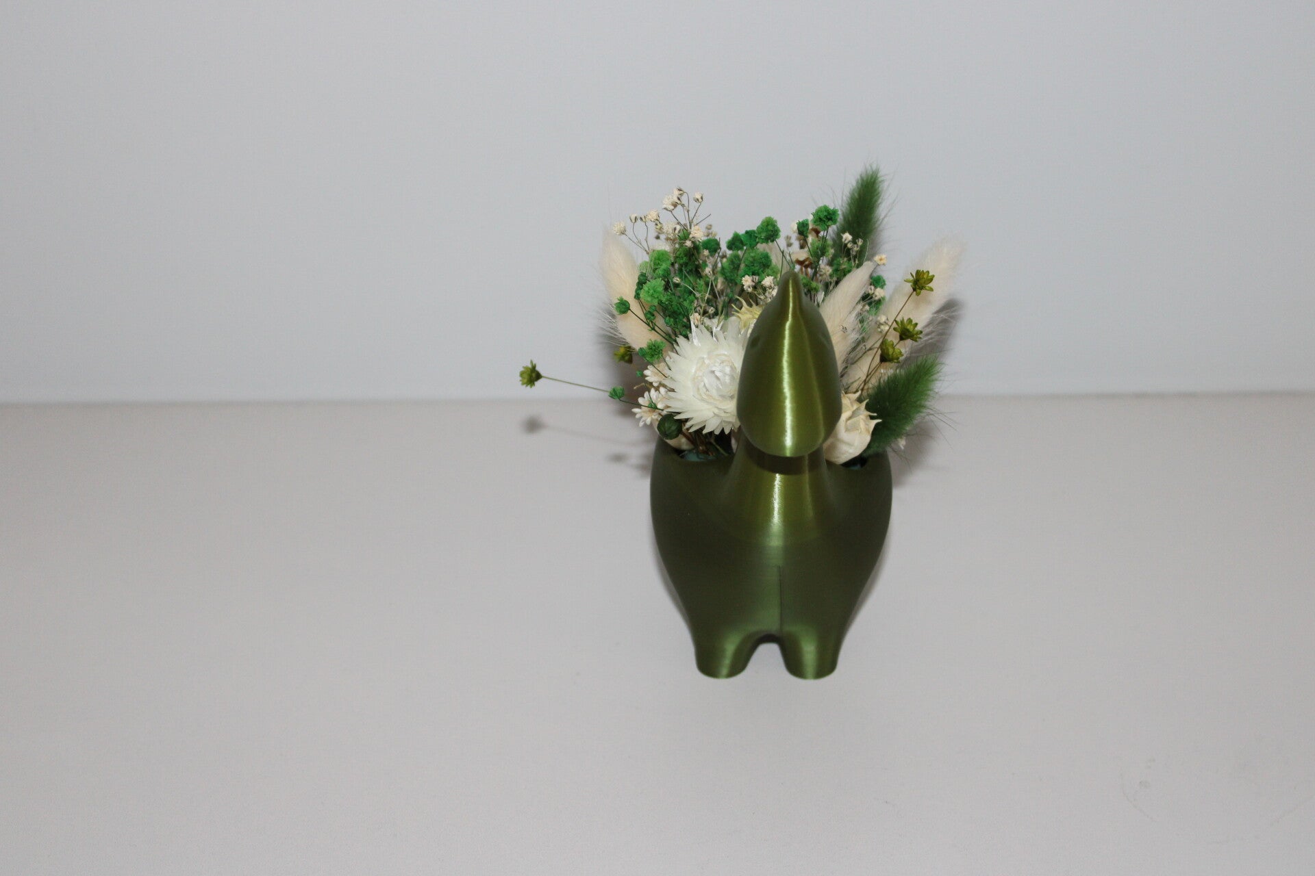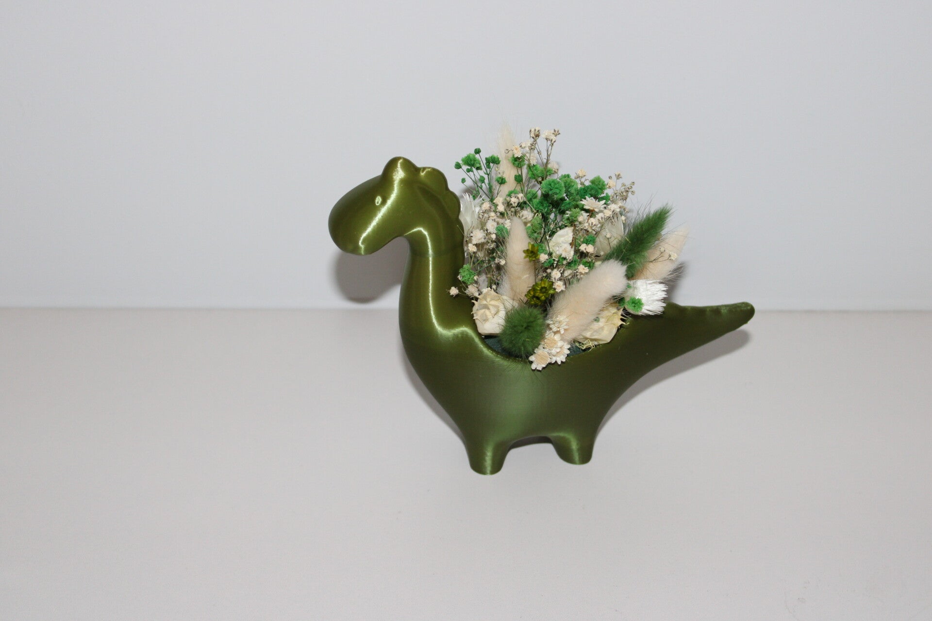 🦖 Decoratieve Dinosaurus in Felgroen – Opgevuld met Groene en Witte Droogbloemen
