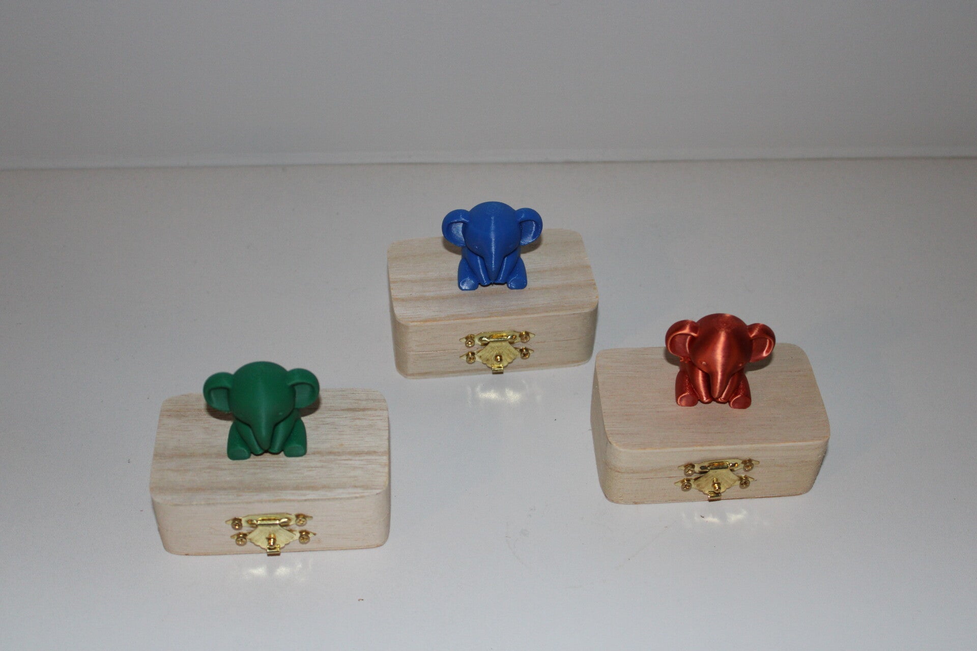 Een charmant en symbolisch geschenk met een warme uitstraling. Dit houten kistje is verfijnd afgewerkt met een bronskleurig, groen of blauw olifantje op het deksel en gevuld met diverse suikerbonen — een vrolijke kleurencombinatie die perfect past bij elke feestelijke gelegenheid.