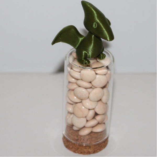 Een origineel en speels geschenk dat meteen in het oog springt! Dit glazen buisje met kurken dop is gevuld met beige mini confetti en afgewerkt met een groene dinosaurus bovenop – een prachtige combinatie van eenvoud, duurzaamheid en vrolijkheid.