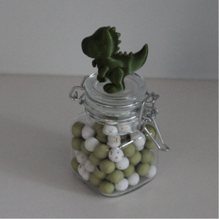 Een stijlvolle en speelse blikvanger voor elke gelegenheid! Deze glazen pot met wekpotsluiting is gevuld met gemarmerde witte en donkergroene chocoballs en afgewerkt met een schattige dino bovenop. Een perfecte combinatie van elegantie en speelsheid, ideaal voor geboorte, communie of lentefeest.