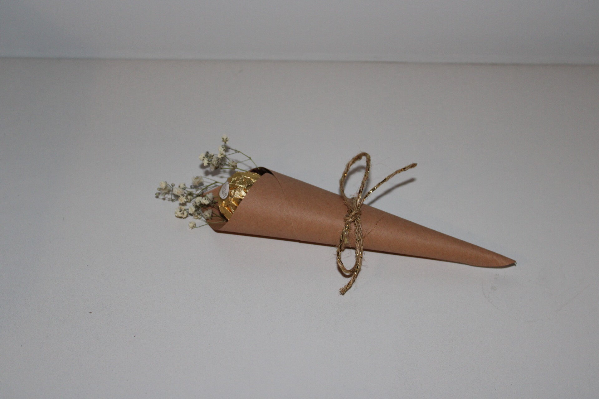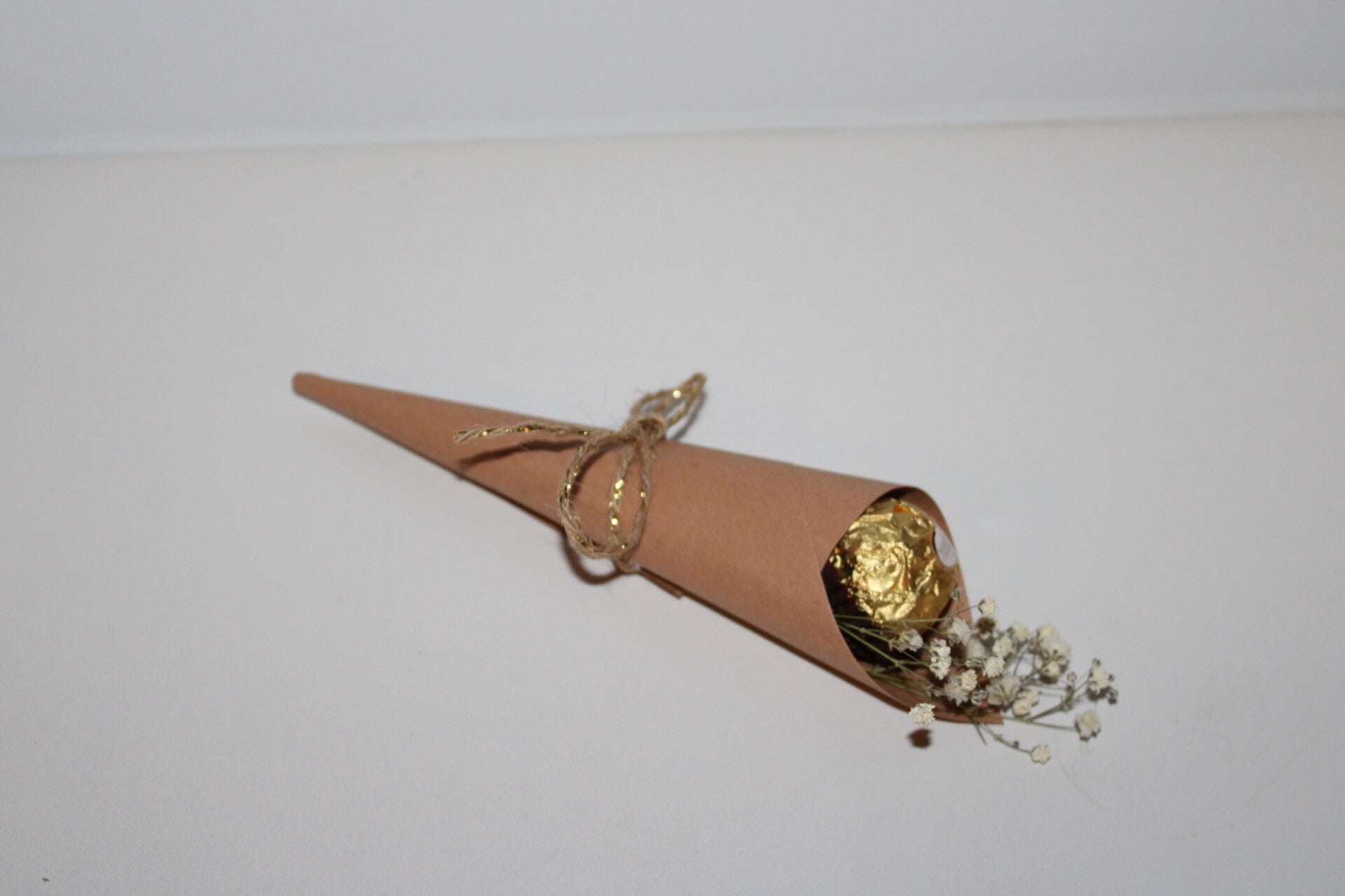 Een elegant en eenvoudig bedankje met een natuurlijke charme. Deze handgemaakte kartonnen kegel is gevuld met een fijne chocolade (Ferrero Rocher), afgewerkt met droogbloemen en natuurlijke touwbinding. De combinatie van warme tinten en subtiele accenten maakt dit geschenkje perfect voor elke gelegenheid.