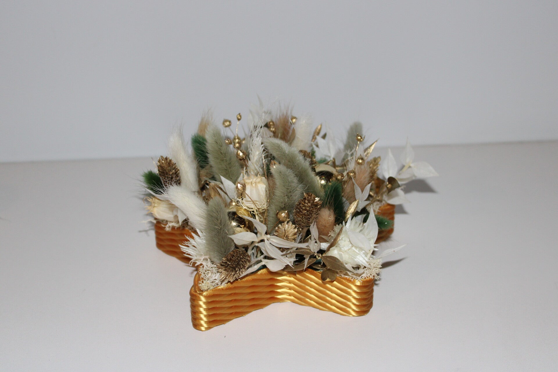 Een elegant en uniek decoratiestuk dat de magie van de feestdagen perfect weergeeft. Dit 3D-geprinte potje in de vorm van een ster is gevuld met droogbloemen in wit-, groen- en goudtinten, zorgvuldig samengesteld voor een stijlvolle en warme uitstraling.