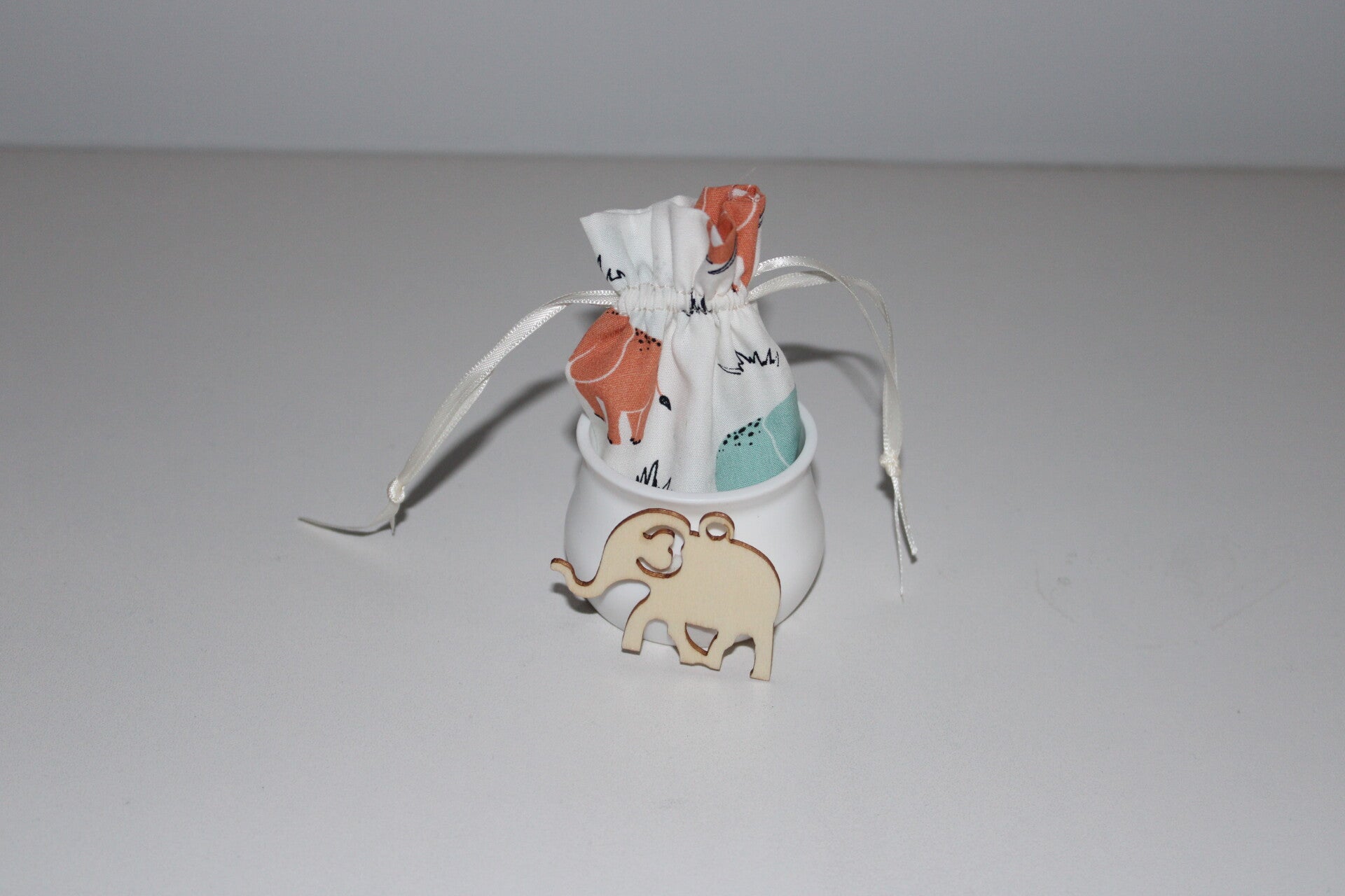 Wit bloempotje met houten olifantje, gevuld met zakje suikerbonen