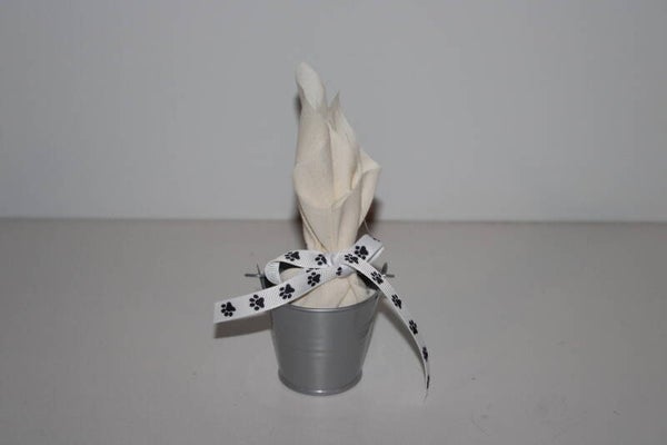 Dit stijlvolle zilveren mini-emmertje uit onze Collectie Hond is een speels en tegelijkertijd elegant presentje. Het emmertje is gevuld met suikerbonen in wit en zwart, afgewerkt met een zacht doekje en een lint met hondenpootjes en hondjesmotief — perfect afgestemd op het thema.